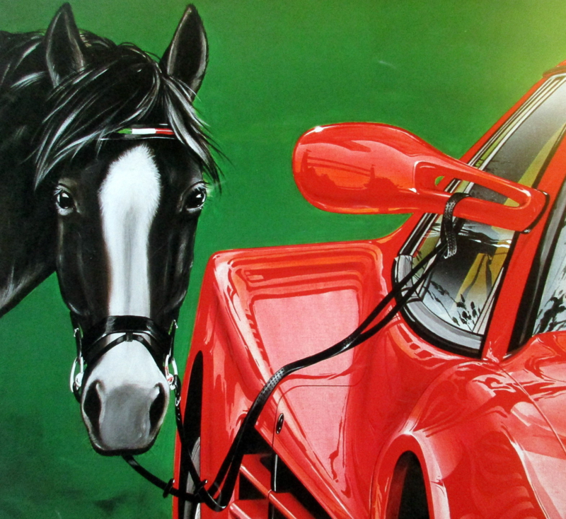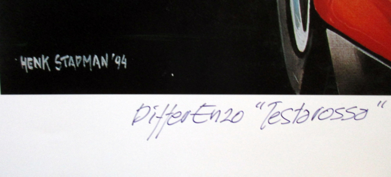 Artist impression/lithograph by Henk Stadman. Ode to the Ferrari Testarossa, limited edition. With a keen eye for detail and a nod to the prancing horse in the Ferrari logo. Even the reflection is beautifully painted, adding extra depth to this artwork, which was created in 1994.