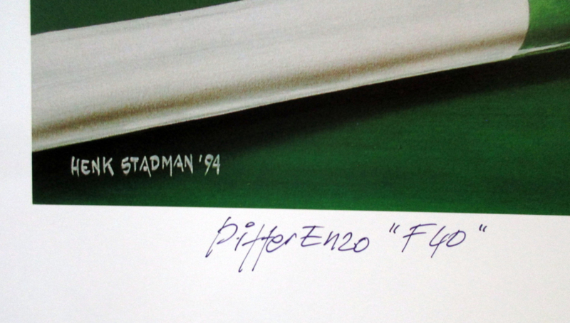 A tribute to the Ferrari F40 by Henk Stadman. Beautiful lithograph in excellent condition. Signed by the artist. With a nod to the prancing horse in the Ferrari logo, which the artist has even incorporated into the reflection of the car.